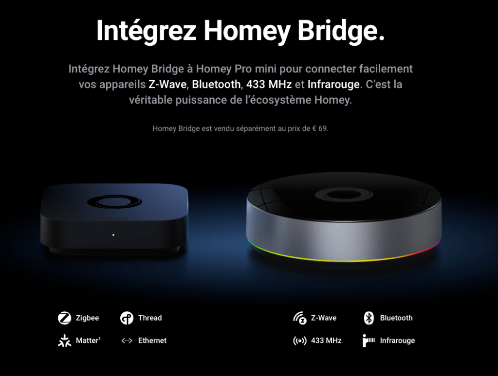 Si votre regard se porte sur le Homey Pro Mini et que l’un de ces protocoles vous est indispensable, Homey propose un boîtier particulièrement intéressant : le Homey Bridge.
