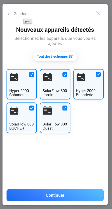 L’association nécessite l’utilisation de votre compte Zendure. Après authentification, l’ensemble des appareils liés à votre compte est automatiquement détecté. Par défaut, tous les équipements sont sélectionnés. À noter toutefois que les icônes utilisées ne sont pas toujours très explicites. Dans mon cas, certains micro-onduleurs Zendure dépourvus de batterie apparaissent avec une icône de batterie, ce qui peut prêter à confusion au premier abord.