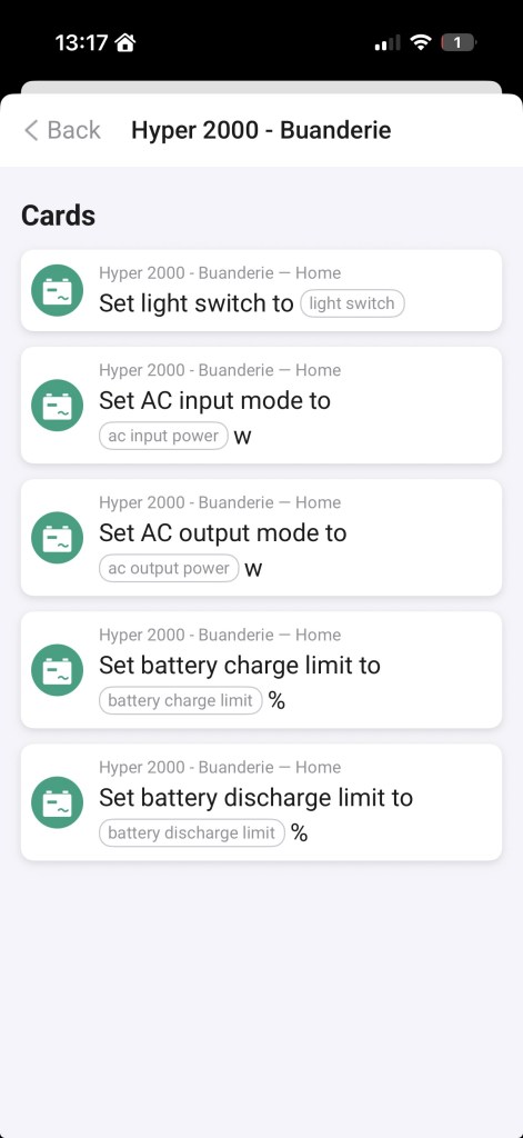 Ces cartes jouent un rôle essentiel de garde-fou. Elles évitent par exemple de forcer une décharge alors que la batterie est déjà basse, ou de lancer une action alors que l’appareil est hors service. C’est ce niveau de filtrage qui rend les automatisations fiables dans la durée.
