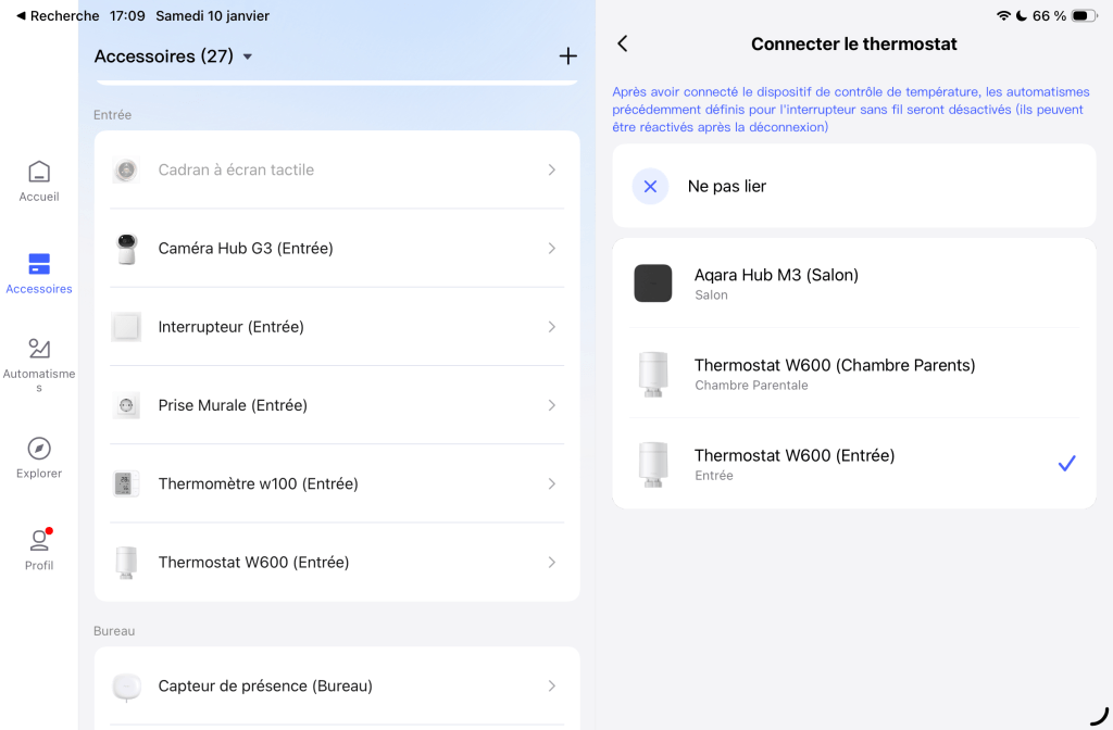 Les deux appareils doivent être présents dans la même maison Aqara (même environnement logique). Le W600 doit être configuré en mode automatique, pas en mode manuel permanent.