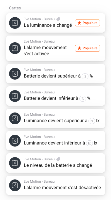 Les cartes de DÉCLENCHEMENT du capteur EVE MOTION sur Homey :