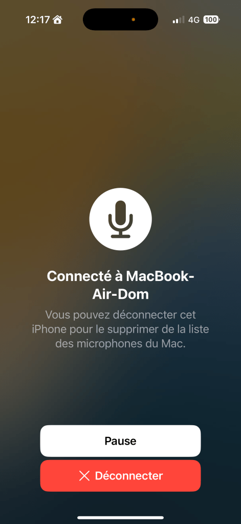 Un son de confirmation retentira sur l’iPhone, et un écran dédié s’affichera : « Connecté à [nom de votre Mac] ». Cela confirme que le microphone de votre iPhone est désormais actif.