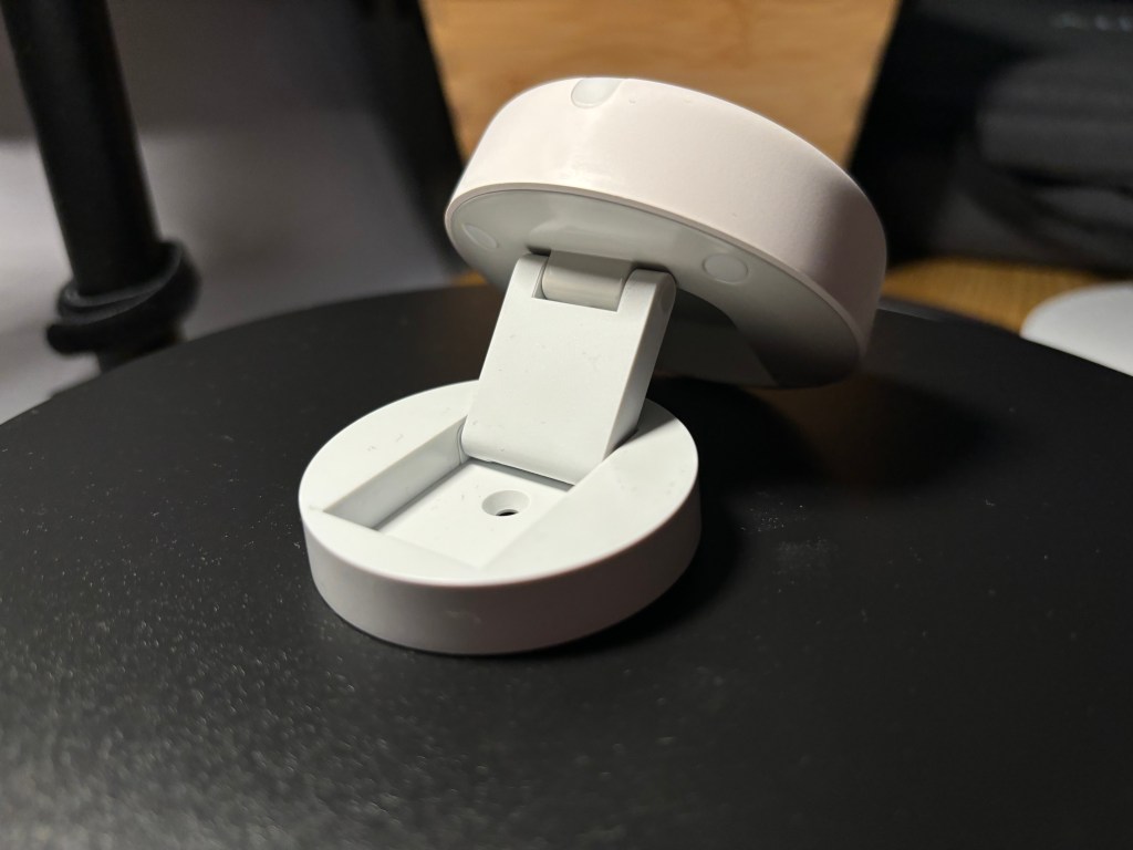 Ses dimensions sont de 12,5 cm de diamètre pour 3,5 cm de hauteur, avec une finition en plastique et un pourtour imitation aluminium brossé. Ce design sobre est conçu pour se fondre dans votre intérieur, loin de l’aspect plus imposant des anciennes versions du Homey Pro.