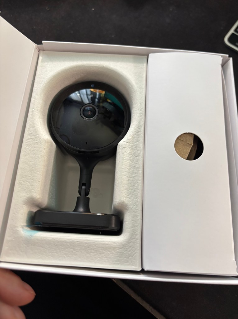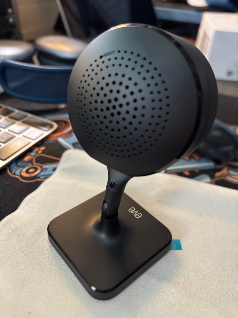 Première impression en déballant la Eve Cam : elle joue la carte de la sobriété. Avec son boîtier noir mat légèrement bombé, monté sur un socle articulé, elle se fond facilement dans n’importe quel intérieur. Sa petite taille (122 x 65 x 60 mm) lui permet d’être discrète sur une étagère, un meuble TV, ou même fixée au mur (grâce au kit fourni).