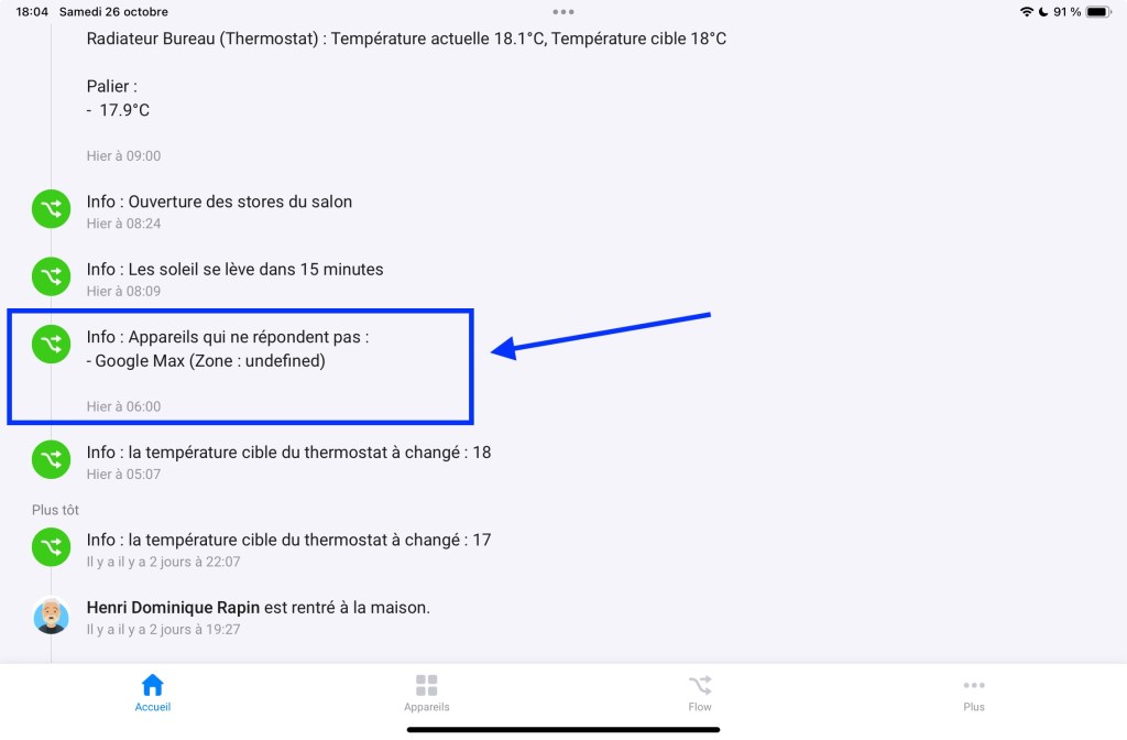 Homey propose également une fonction très utile : la possibilité d’envoyer une notification si une action échoue. Si une commande n’est pas exécutée correctement, je suis immédiatement alerté. C’est précieux dans la gestion du chauffage.