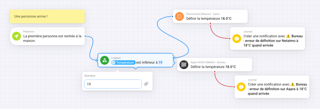 Autre automatisation pratique : lorsque la dernière personne quitte la maison, Homey baisse automatiquement la consigne à 17°C. Aqara peut aussi faire ce type de règle, mais Homey est plus efficace lorsqu’il faut gérer plusieurs occupants.