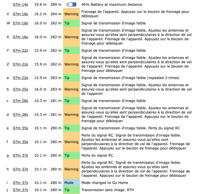 Extrait du journal de vol du DJI Fpv, pas top cette communication entre le Drone, les lunettes et le Motion Controller :