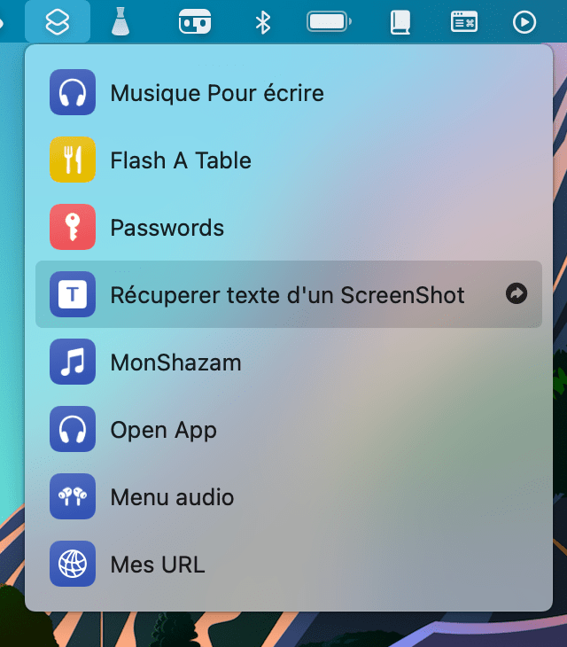 Dès lors, une nouvelle icône apparaît dans la barre des menus. En cliquant dessus, vous verrez de nouveau une collection de raccourcis. Attention cependant : l’ajout de nouveaux raccourcis dans ce menu est désormais plus complexe, et l’interface semble moins intuitive qu’auparavant. On peut se demander ce que cherche Apple avec ce choix.