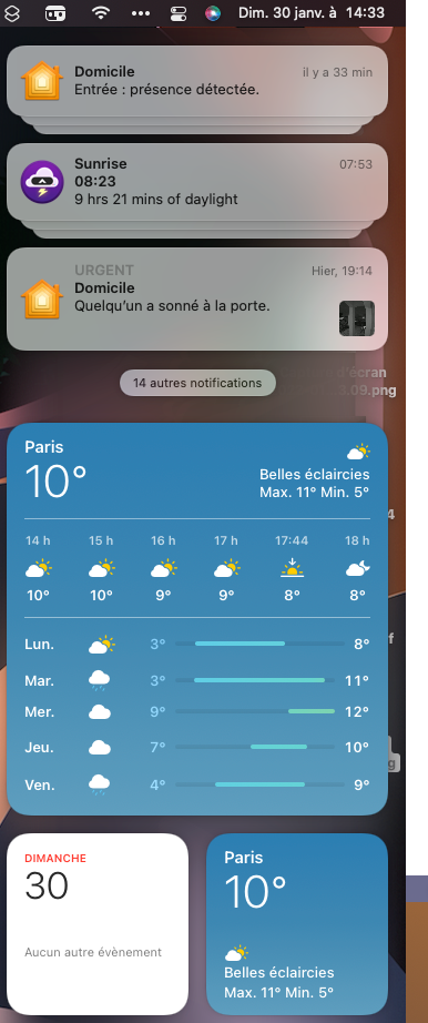 L’icône du centre de notifications est depuis Big Sur remplacée par l’Horloge. L’horloge dans la barre des menus est resté sous Monterey, c’est le moyen suggéré par Apple pour accéder aux notifications ou aux widgets. Vous devez cliquer sur l’horloge avec la souris, ce n’est pas le plus simple. Ensuite, un résumé des dernières notifications apparait au dessus des premiers widgets.