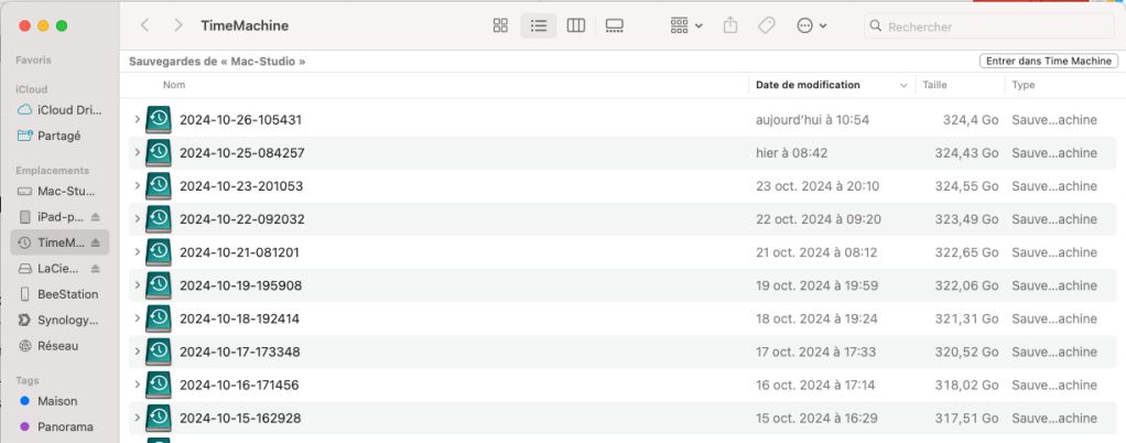 Je me dois de souligner que je n’ai jamais réussi une restauration avec ce type de sauvegarde. Si vous avez des donner à sauvegarder depuis un volume externe : Dupliquez le avec CCC ou synchronisez les données avec un dossier sur un NAS avec ChronoSync !
