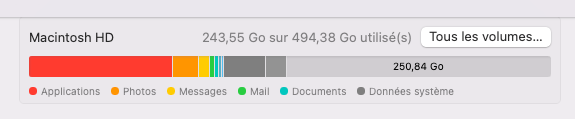 Lancez depuis le Menu pomme « A propos de ce Mac », puis cliquez sur le bouton « Plus d’infos … », là sélectionnez l’onglet stockage :