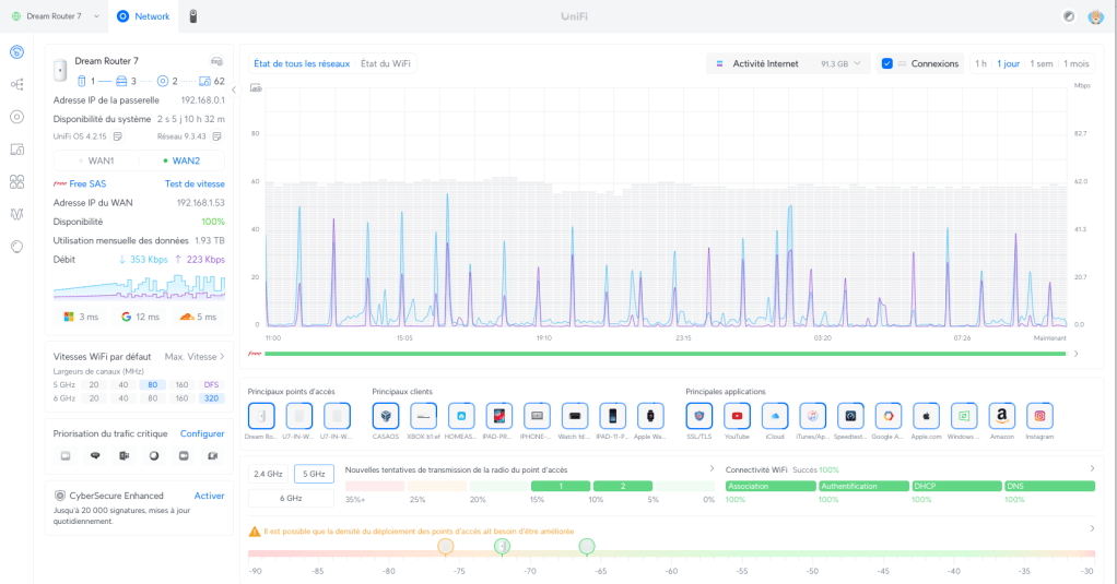 Le Dream Router 7 ne se limite pas à être un simple routeur Wi-Fi : c’est une véritable plate-forme unifiée de services réseau. Dès la première installation, l’appareil embarque le logiciel UniFi OS d’Ubiquiti, qui inclut plusieurs modules clés accessibles via une interface web (navigateur) ou application mobile intuitive. Voici les principales fonctionnalités livrées en standard avec ce routeur :