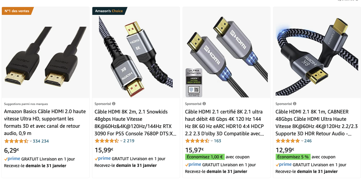 Si vous n’avez pas un bon câble, passez votre chemin vous n’aurez pas mieux que les 48 Gb/s de la norme 2.0. Un câble HDMI est l’équivalent d’un câble Ethernet mais pour le monde de la vidéo. Celui-ci doit être sélectionné pour sa compatibilité avec une norme. Evitez les câbles « sans marque » (pas cher) qui n’indique même pas la norme supportée, vous n’aurez que des déboires avec ces modèles.
